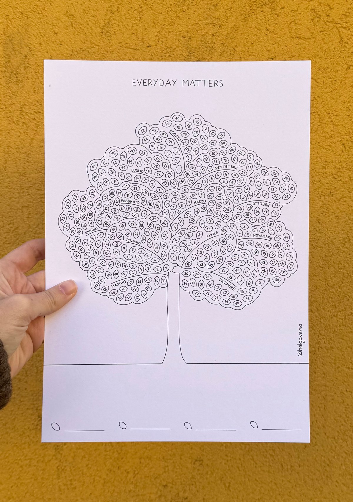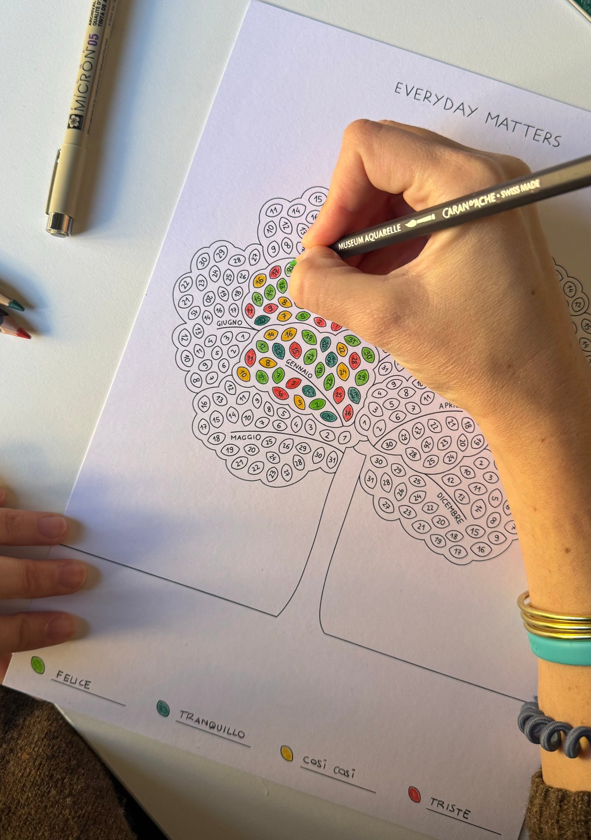Personalizza il tuo albero assegnando a ciascun colore un valore, uno stato d'animo, un obiettivo o qualsiasi altro elemento che desideri monitorare. Compila la legenda e fai crescere il tuo albero giorno dopo giorno colorando ogni foglia in base a ciò che per te conta davvero!